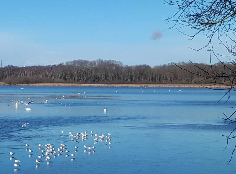 28 marcheurs se sont donnés rdv pour 15 km , journée hivernale froide mais de belles couleurs autour de St Quentin en Yvelines, la ville nouvelle, l'étang gelé et ses mouettes, et le Vélodrome National.