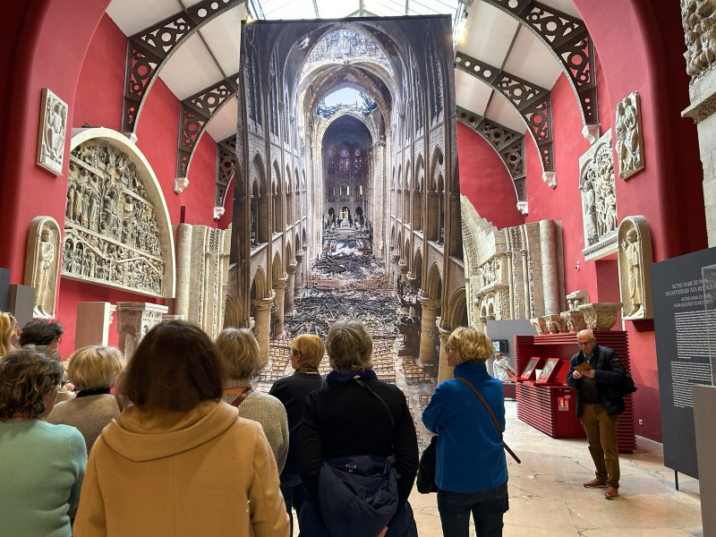 Premier objet choc exposé devant lequel ils s'arrêtent : une immense affiche dévoilant l’intérieur de Notre-Dame, entièrement dévasté par l’incendie du 15/04/2019, image qui défraya les chroniques du monde entier. Cet incendie emporta dans les flammes la charpente en bois « la forêt » et une partie des voûtes, édifiées à partir de 1163 ainsi que sa flèche élancée de 96 mètres, érigée par Viollet-le- Duc au XIXème siècle.